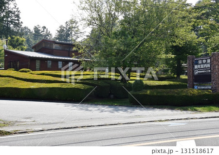 山梨県 山中湖グリーンパーク(山中湖文学の森公園)の正門と深緑
