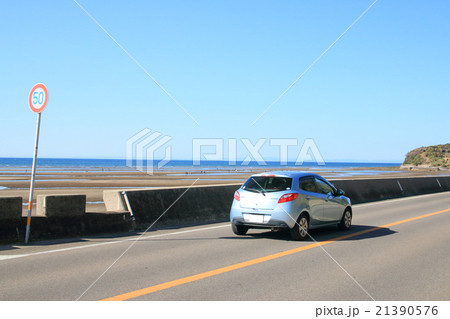 国東半島の恋叶ロード ドライブイメージ(国道213号線 豊後高田 真玉海岸前と黒いコンパクトカー)