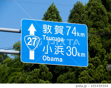 道路標識(案内標識)。国道27号、福井県大飯郡高浜町下車持にて。