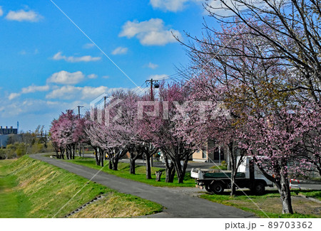 札幌市厚別川沿いの桜並木です。ピンクと白のエゾヤマザクラが並んでいます。