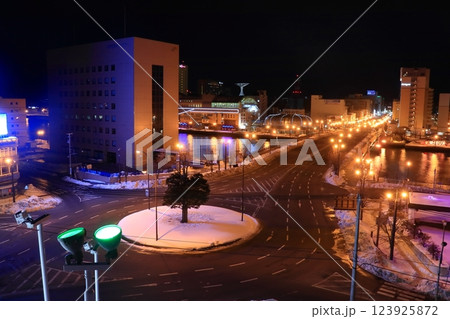 幣舞公園から眺める夜の幣舞橋と雪が残るロータリー道路
