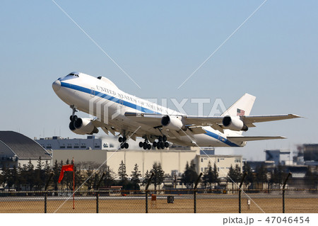 離陸するアメリカ国防長官が搭乗したE-4Bナイトウォッチ(横田基地・東京都福生市)