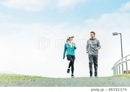 健康のため朝公園でウォーキング・散歩・有酸素運動するスポーツウェアを着たアジア人の男女