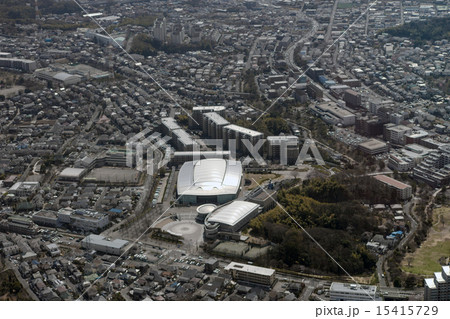日本の横浜都市景観 9月。横浜市営地下鉄グリーンライン 北山田駅前などを望む。左奥に横浜国際プール