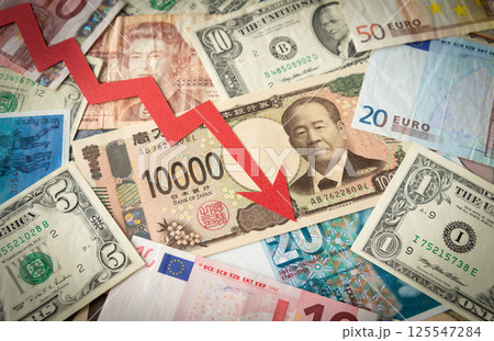 一万円札と右肩下がりの矢印 下降 紙幣 下向き