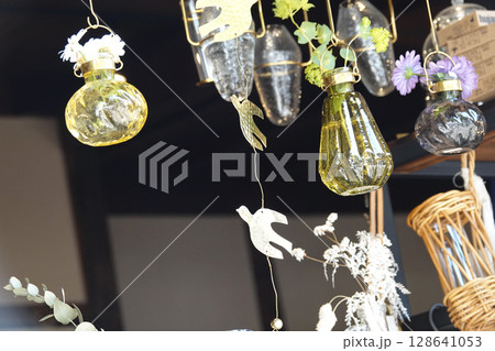 石見銀山 町並み地区 古民家の縁側 和風の花器に生けられた草花