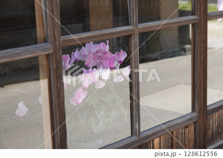 古民家のガラス戸越しに見えるピンクのシクラメンの花