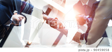 ラウンジで握手する多国籍ビジネスパーソンのグループ