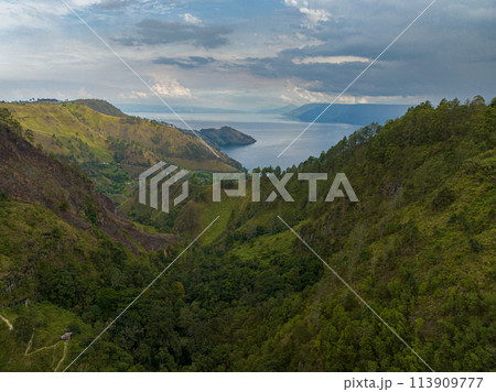 Lake Toba among the mountains with tropical vegetation. Sumatra, Indonesia.
