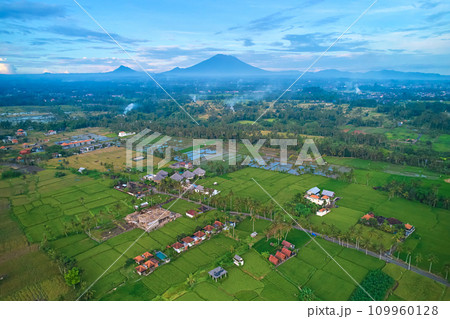 Panorama of Mount Agung and rice fields on the island of Bali.