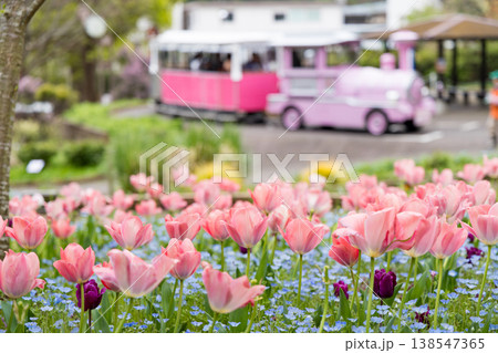 春の花畑 カラフルなチューリップとフラワートレインの風景