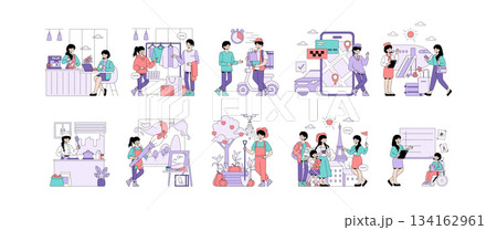 Vector illustration set portraying various occupations and activities, including barista service, shopping, delivery, navigation, travel, cooking, painting, gardening, tourism, and education.