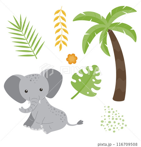 Cute childrens animals set isolated on a white background elephant, palm tree, liana, leaves. Flat vector illustrations for children.