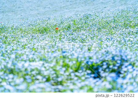 一面に広がるネモフィラの花畑とポツンと咲くポピー