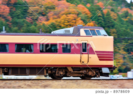 鉄道 列車 山陰本線 京都口 園部~船岡 紅葉 もみじ 秋 381系 国鉄色 特急 JR西日本 嵯峨野線 流し撮り 流し サイド 横