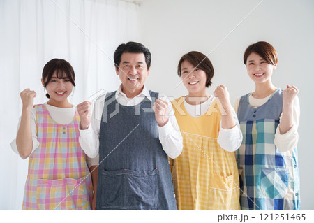 ガッツポーズをする保育士や介護士、園長先生のカメラ目線イメージ