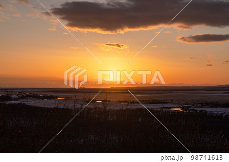 釧路湿原に沈む夕日と夕焼け色に染まる雲