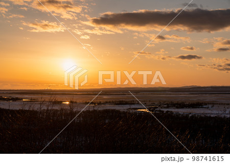 夕暮れ時の凍てつく冬の釧路湿原