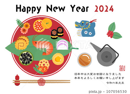2024年辰年の年賀状 おしゃれなワンプレートおせち料理のイラスト
