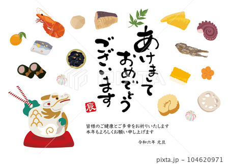 年賀状 2024年 お節と龍の置物のイラストのデザイン 文字なし