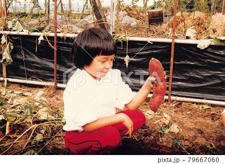 昔のフィルム写真 運動会にて グラウンドに座る小さな男の子