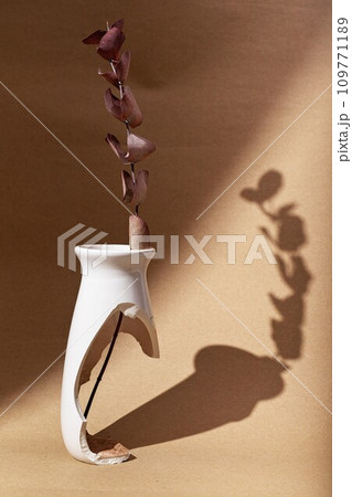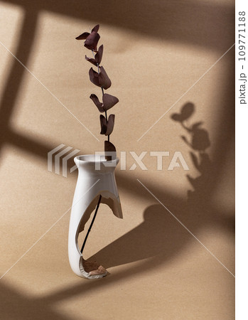 Leaf branch in broken vase. Dry dead plant in cracked shattered pottery. Death concept