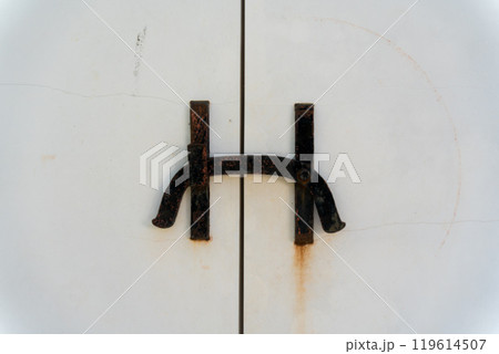 白い蔵の扉と錆びた閂