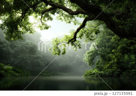 The serene view of this forest lake offers a tranquil escape into nature, highlighting the lush green canopy and misty atmosphere