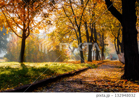 city park autumn scenery on sunny morning. trees in yellow leaves near path and green lawn. uzhhorod old street in bright light. alley covered in fallen foliage. scenic urban landscape of ukraine