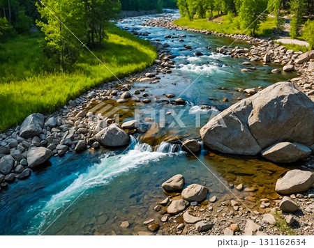 Aerial view of beautiful small stream flowing pass boulders in the green forest in spring season.