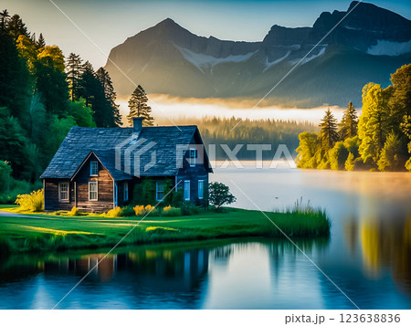 View of a wooden house with a chimney in the forest near the lake with high mountain in the background