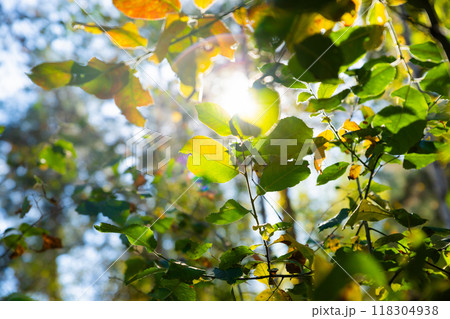 Sunbeam or Sun flare through summer or autumn green leaves of trees