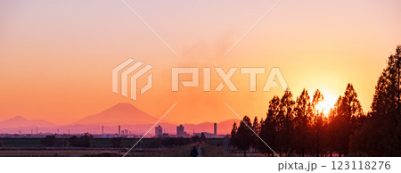 「埼玉県」荒川河川敷から望む夕景の富士山 さいたま市