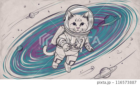 【宇宙服を着て宇宙空間に浮かぶスペースキャットの絵】星と土星と宇宙猫 宇宙飛行士 横長16対9