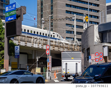 東京高速道路・土橋入口にある親柱【高速道路昇路】と東海道新幹線