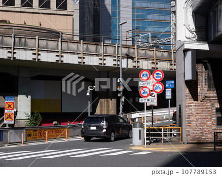 東京高速道路 土橋入口の歩行者・自転車進入禁止を示す規制標識