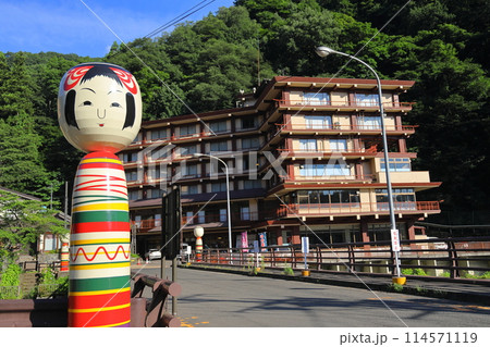 福島 福島市 土湯温泉の街並み(荒川大橋と土湯こけし)