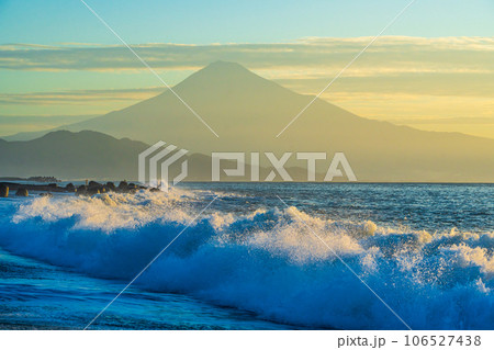 三保海岸から見る朝焼け空と富士山に大波