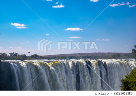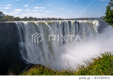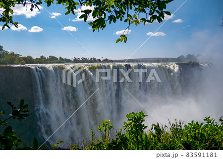 水煙の上がる乾季のビクトリアフォールズ、緑の額縁