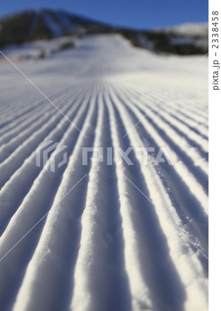 朝一番のゲレンデに広がる美しい圧雪のコーデュロイ模様 (長野県、飯山市、戸狩温泉)