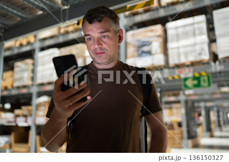 Warehouse worker checking smartphone