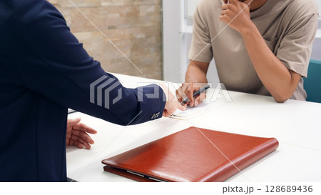 書類にサインする黒人男性と日本人女性スタッフ