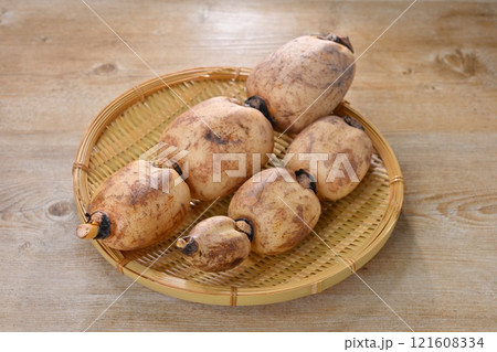 ざるに盛ったじゃがいもと玉ねぎ テーブルフォト