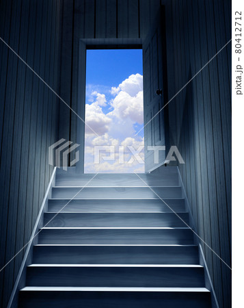 Hope and spirituality concept. Steps leading from a dark basement to open the door