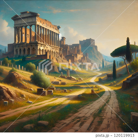 Ancient roman ruins in idyllic countryside landscape at sunset
