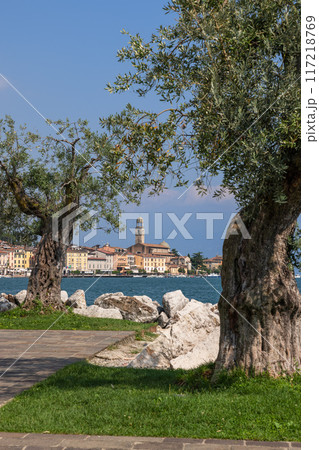 Vertical view through old olive trees to historic Salo on Lake Garda