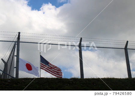 フェンス越しに見える日本国旗と星条旗