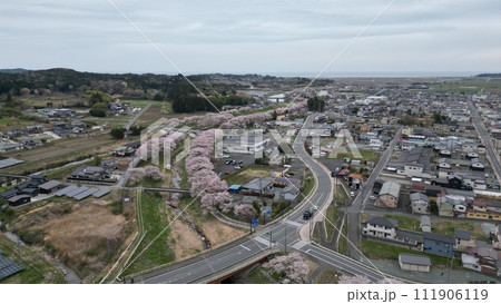 春色満開 - 南相馬市小高区の小田川の桜並木空撮