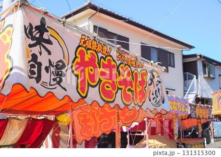 通りに並ぶお好み焼きと焼きそば屋台の風景
