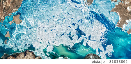 Ice pattern on satellite photo, aerial top view of blue glaciers